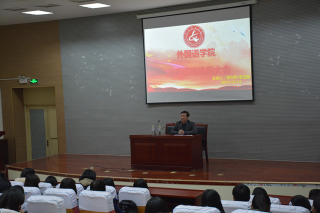 12月13日晚,外国语学院于图书馆一楼报告厅隆重召开迎评促建动员大会,学院党委委员、副院长贺兴利为2015级学生做了动员报告,会议由党总支书记董玉新主持。