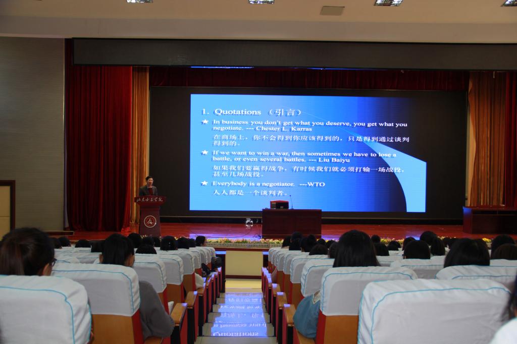 10月26日下午,应外国语学院邀请,山东工商学院外国语学院院长、山东省商务英语研究会会长刘白玉教授在图书馆二楼报告厅为商务英语专业全体师生做了题为“国际商务谈判策略研究”的讲座,讲座由赵淑容院长主持。
