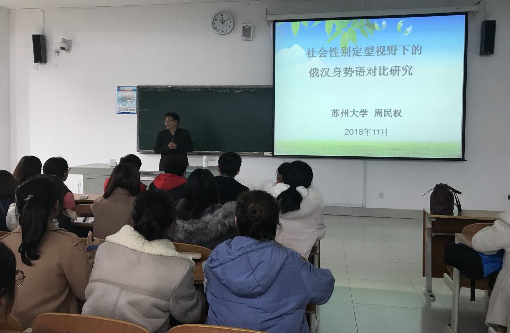 2018年11月29日下午,应外国语学院邀请,苏州大学外国语学院博士生导师、西安外国语大学“西外学者”特聘教授周民权来校开展了题为《社会性别视野下的俄汉身势语对比研究》的讲座,外国语学院俄语专业师生听取讲座。