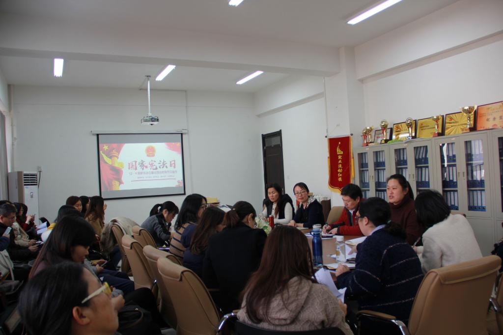 2018年12月20日,分会在学院会议室开展集中宣传。分会主席讲述了国家宪法日的由来和设立背景,阐明宣传今年第五个宪法日的主题是“尊崇宪法、学习宪法、遵守宪法、维护宪法、运用宪法”。带领全体教师学习宪法宣誓制度和誓词,特别强调“维护宪法权威”“恪尽职守、廉洁奉公”“努力奋斗”,要求全体教师规范自己的教育教学行为,依法从教,维护教师的高尚形象和宪法的尊严。