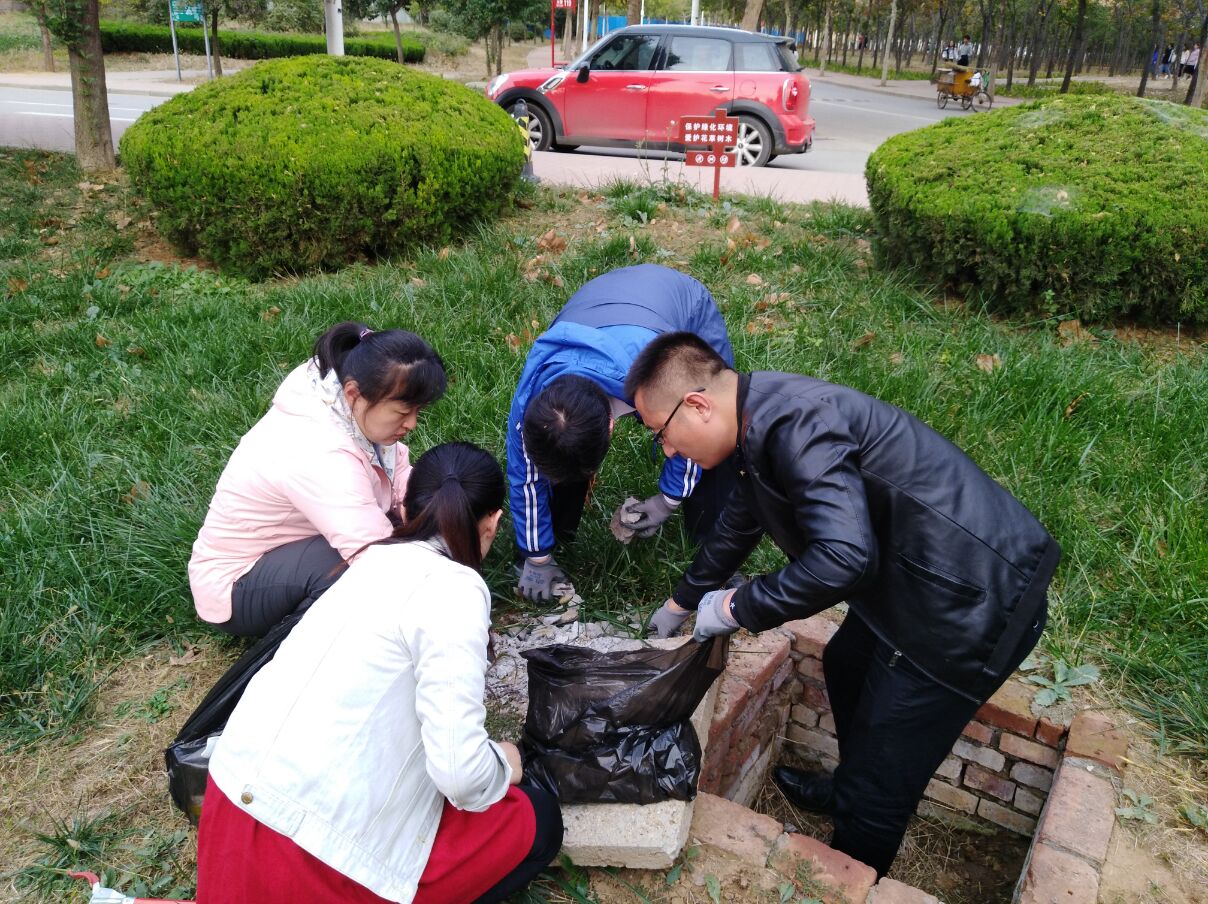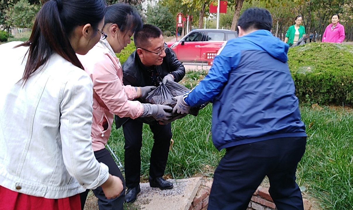 在外国语学院卫生责任区食堂南到排球场南侧马路(含运动场地内的清理),全体师生党员有的一手拿垃圾夹钳,一手拿垃圾袋;有的多人合作,一人拿垃圾袋,其他同志拿垃圾夹钳把垃圾夹进垃圾袋;有的捡拾草丛中的砖头石块。大家热情高涨,不放过任何一点隐藏的垃圾。党总支部书记董玉新带头撸起袖子,把散落在草丛中的砖头石块搬到路边集中堆放,方便垃圾车清理。经过一下午的努力,同志们将草丛中的烟头、碎塑料袋、小食品包装袋、矿泉水瓶盖、乱放的石头和木块全都清理干净。