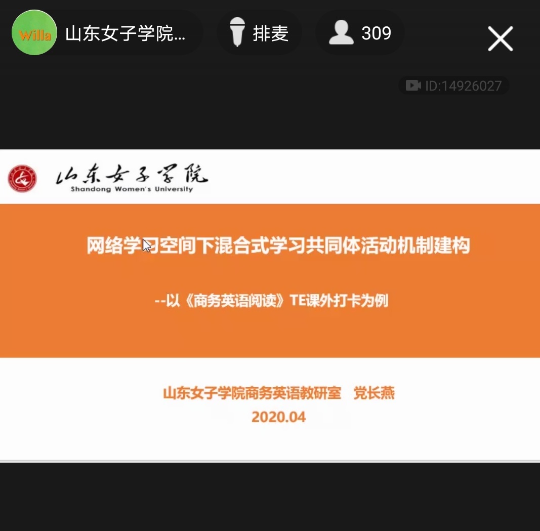 党老师以《网络学习空间下混合式学习共同体活动机制建构--以<商务英语阅读>TE课外打卡为例》为主题,结合2017年以来所做的基于学习共同体理论的教学改革和实践,做了精彩的分享。她的发言得到了参会同行的认可,在研讨会群里引发了热烈的讨论,老师们纷纷留言说:“受益匪浅“,“操作实践性和可操作性特别强”,“倾心分享,干货满满”。
