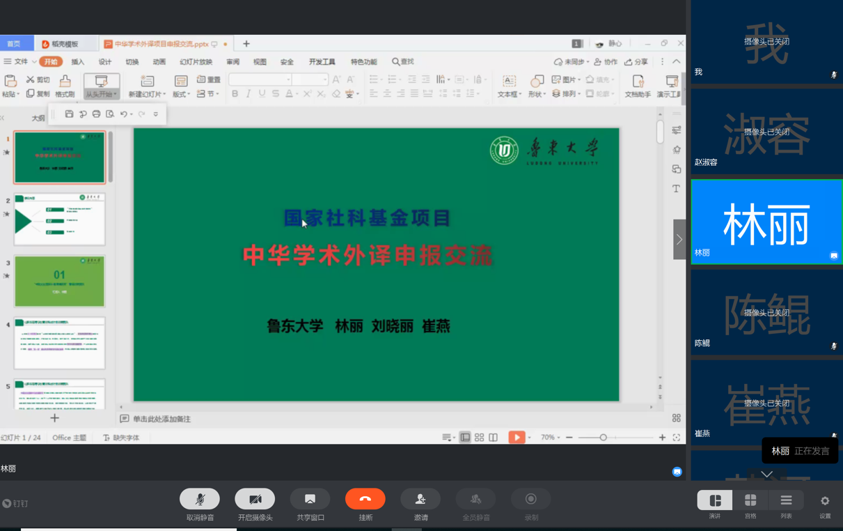2020年6月16日,外国语学院邀请鲁东大学林丽、刘晓丽、崔燕三位老师就青创团队建设及中华学术外译项目申报的有关问题作了专题讲座,外国语学院全体教师参加了此次活动。