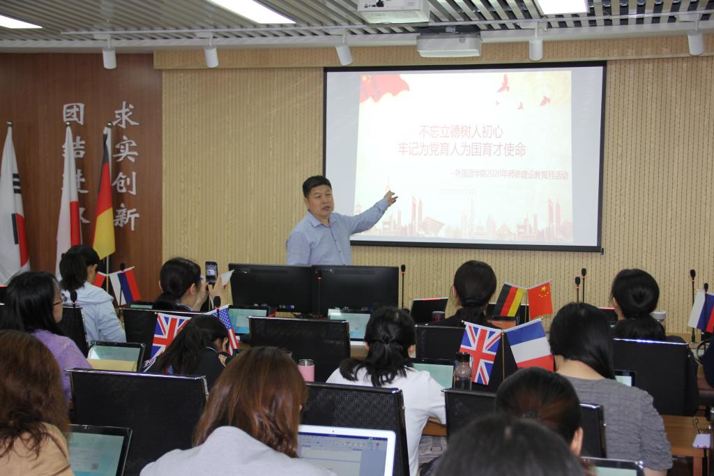 为进一步贯彻习近平总书记关于经济社会发展工作的系列讲话精神,全面提升广大教职工的思想政治素质和职业道德水平,贯彻落实学校师德建设教育月活动方针,9月24日下午,外国语学院开展了“不忘立德树人初心、牢记为党育人为国育才使命”师德建设专题活动,活动内容精彩纷呈,从主题演讲到访学教学经验分享,从“最美教师”表彰到“做四有好老师”倡议签名,全体教师热烈交流教书育人的心得,情真意切,场面感人。活动由党总支书记董玉新主持。