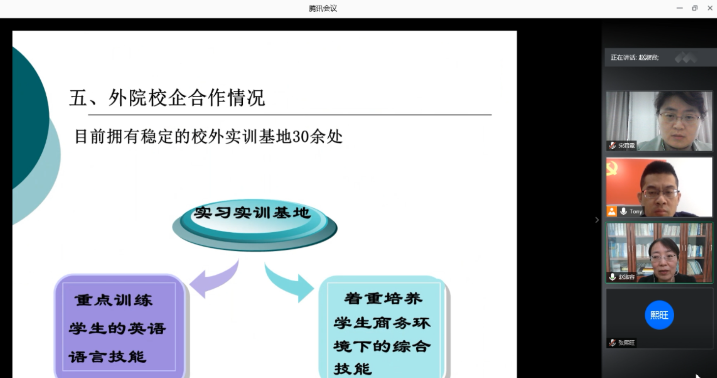 10月15日上午,外国语学院与山东佐佑教育集团发展有限公司举行校企合作交流洽谈会,受疫情影响,本次洽谈会采用线上形式进行。双方参加洽谈会的主要人员有,外国语学院院长赵淑容、副院长宋君霞,山东佐佑教育集团发展有限公司董事长王倩、CEO张鹏。