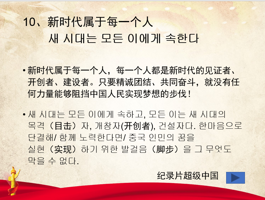 韩语专业副教授孙虹老师确定主题为“读时政 学韩语”。孙虹老师以轻松活泼的韩国娱乐文化为切入点激发起学生们的学习乐趣,引导学生作为外语学习者要了解对象国的经济、历史等有深度的内容,用外语讲好中国故事。孙虹老师重点带领大家一起用中韩双语学习了《习近平谈治国理念(第三卷)》中习近平总书记在第十三届全国人民代表大会上的讲话内容,并结合以习近平同志为总书记的党中央的治国理念和执政方略对其进行了深入的分析探讨。最后,孙虹老师寄语学生不仅要具备广博知识、国际视野,更要有家国情怀,社会责任感,在激扬青春的过程中书写无愧于时代的壮丽篇章。