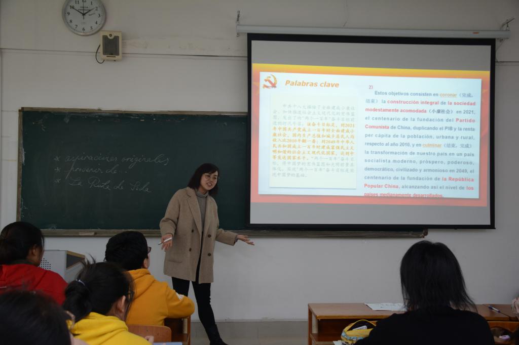 西班牙语专业副教授付彩艳博士以一段生动有趣的动画视频导入,向大家展示了我国建国前后及建国以来的重大历史事件。之后带领大家对《习近平谈治国理念(第三卷)》中有关“一带一路”倡议,“两个一百年”的奋斗目标和“三严三实”等的含义进行了深刻解读。在解读中融入应用西班牙语的专业知识,在润物无声中将价值观引导融入知识传授和能力培养中。付彩艳老师向学生强调要牢记习总书记对青年一代的殷切希望,做到不忘初心,牢记使命。在以后的学习生活中充分发挥语言优势,扎根中国大地,提升全球视野,做一个知国情,通语言,有视野的杰出青年。