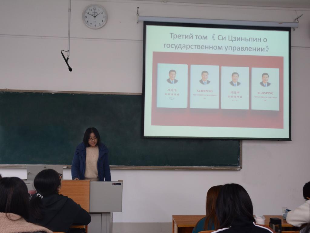 日语专业岳小冬老师用中文和日语两种语言,向大家讲解了《习近平谈治国理念(第三卷)》中我国的社会主义核心价值观、中央八项规定、四项基本原则、四个自信、“三步走”等战略目标。与学生们一起对书中的理念思想进行了探讨学习,帮助大家进一步认识到我国当前的国情以及作为青年应担负起的时代责任和历史使命,鼓励学生用习近平总书记的系列讲话精神武装头脑,立足大局大势,明确未来方向,自觉将个人成长与国家事业结合起来,为实现“两个一百年”的奋斗目标做出应有贡献。