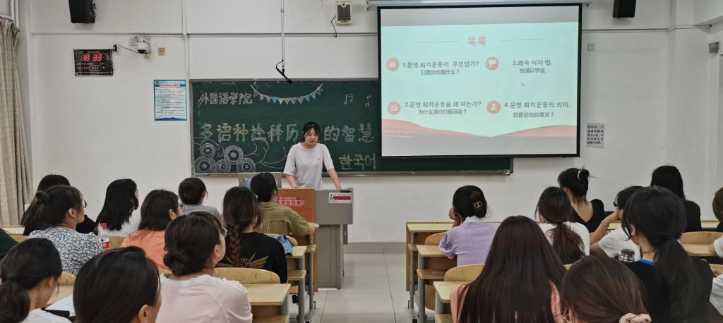 应用韩语专业张雪以新中国成立初期轰轰烈烈的“扫盲运动”为切入点,深入浅出的讲解了“为什么要进行扫盲运动”“怎样实行的扫盲运动”,“扫盲运动带给我们的启示”三方面内容。张雪表示,我们要从历史经验中汲取力量,不断学习和迭代,彰显青年一代理想担当,为构筑中国精神、中国价值、中国力量注入生气勃勃的青春动能。