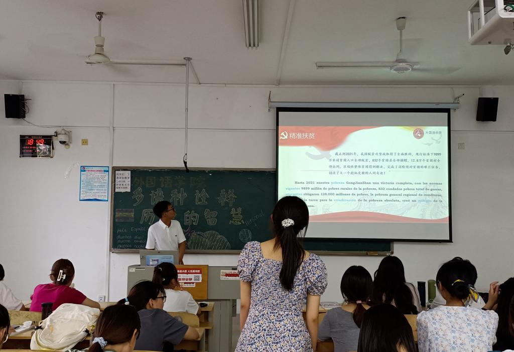 应用西班牙语专业时淑磊首先围绕“百年初心,历久弥新”的主题向大家展示了建党以来中国在科技、文化、外交等方面取得的伟大成就,随后从“以史为鉴,继往开来”“力挽狂澜,日新月异”“担当重任,勇做新人”三个方面为大家带来了一场生动的党课。在讲解的同时,时淑磊同学积极与台下同学互动,为大家解读文章中的语法知识,将党史故事有机融入到西语课程教学。党课最后,时淑磊呼吁大家,在实现“两个一百年”奋斗目标的关键时期,我们青年一代要勇担使命在肩,克服前进道路上的一切困难,为实现中华民族伟大复兴的中国梦而努力奋斗。