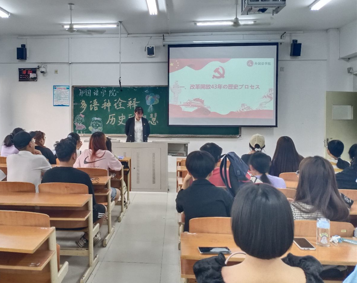 日语专业刘欣以“改革开放 继往开来”为主题,采用中日双语讲解方式,从改革开放的基本脉络、改革开放史是中国共产党推进社会主义制度自我完善和发展的历史、改革开放的经验总结三个方面带领大家回顾了新中国改革开放40多年的成就以及与时俱进的理论创新和实践努力。鼓励大家将党史精神内化于心、外化于行,把学习领悟党的百年历史作为践行党的初心和使命的重要途径。