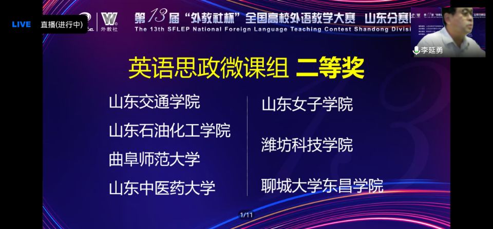 在刚刚落下帷幕的第十三届“外教社杯”全国高校外语教学大赛山东赛区的决赛中,我校外国语学院王欣老师以第二名的优异成绩荣获英语综合课组一等奖,吴兆丽老师带领的教学团队获得英语思政微课组二等奖。