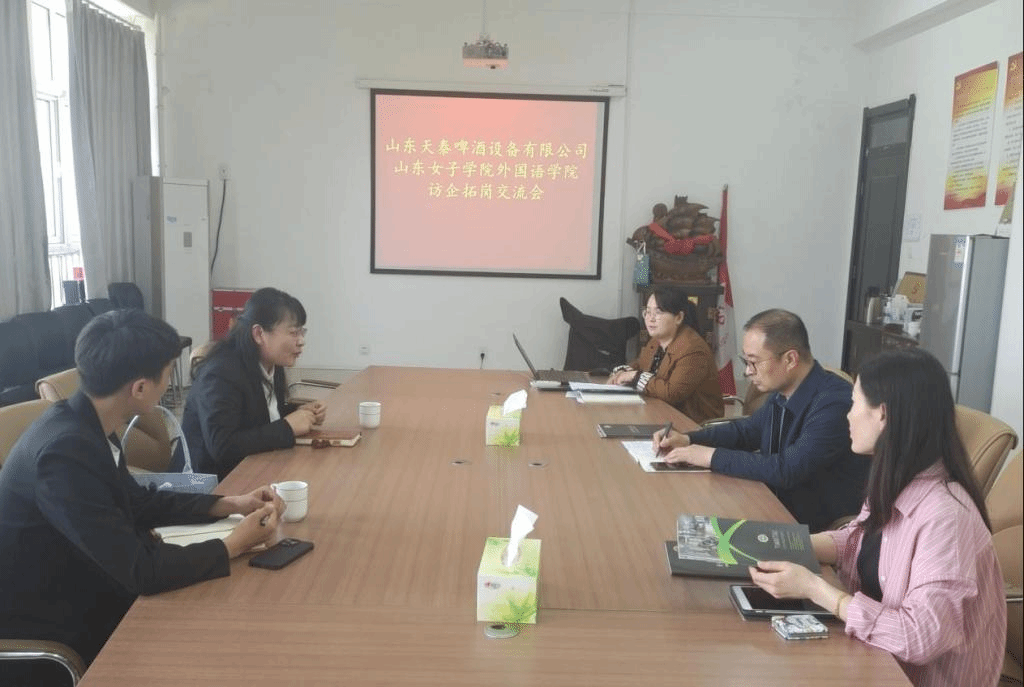 为贯彻党中央、国务院“稳就业”“保就业”决策部署及教育部“春季促就业攻坚行动”工作要求,为2023届毕业生开拓更多就业岗位和机会,4月19日,外国语学院邀请山东天泰啤酒设备有限公司来校交流洽谈,学院党委书记、商务英语教研室主任、辅导员老师参加会议。