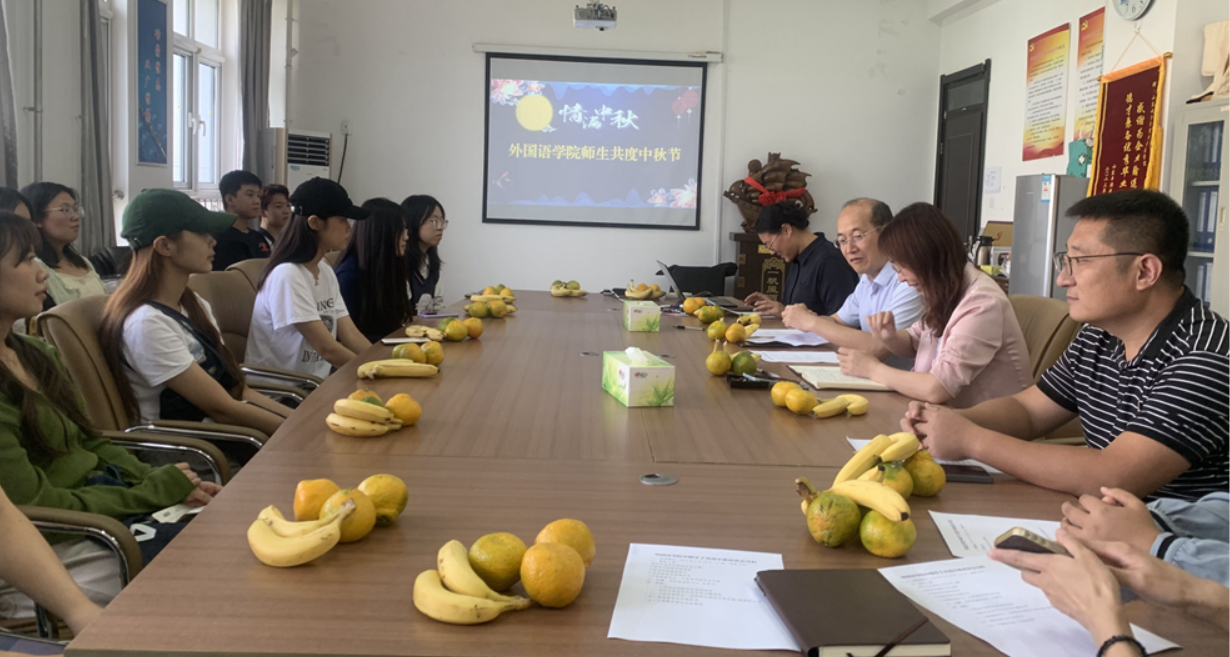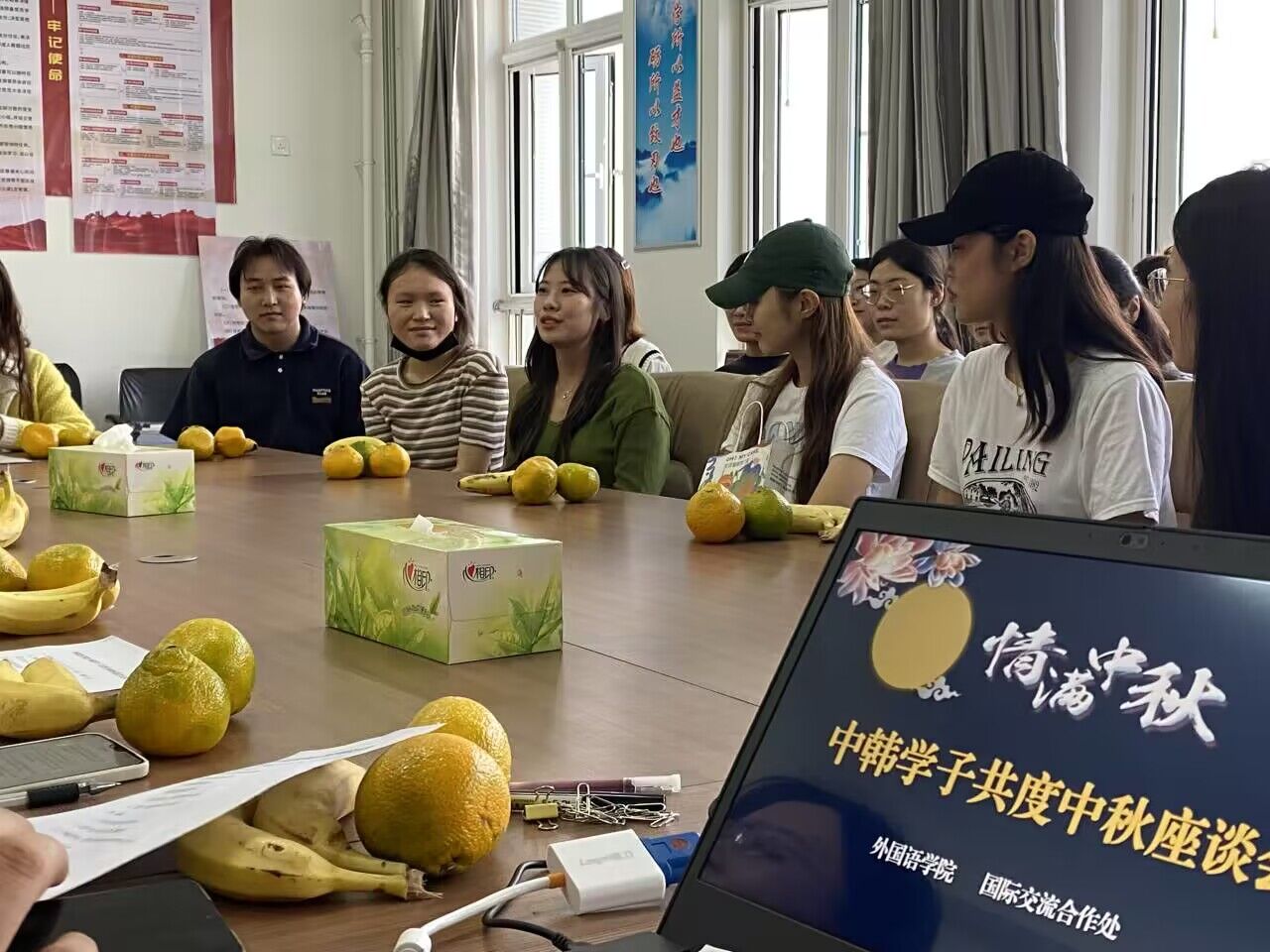 明月照他乡,相伴亦团圆,为关照好假期留校学生,9月28日,外国语学院“情满中秋”师生共度中秋暨中韩学子交流会在博雅楼403会议室举办。国际交流处处长、外国语学院院长、专业教师代表、全体辅导员老师、16名假期留校学生代表,我校首批韩国韩信大学的3名留学生也受邀参加了此次交流会。