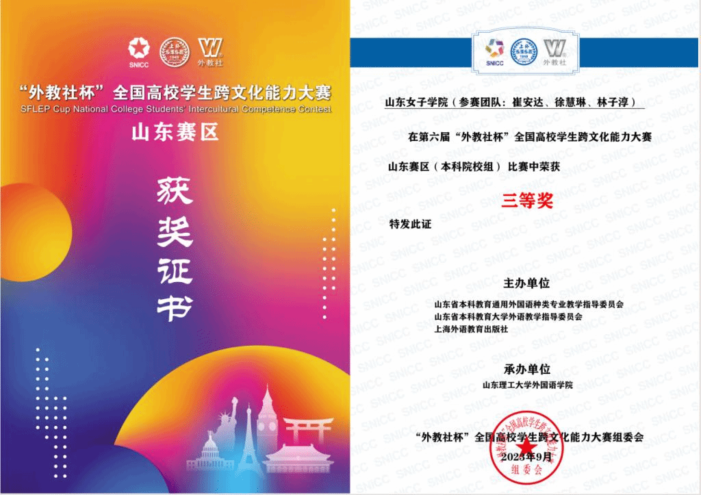 9月24日,我校三名学生在“外教社杯”全国高校学生跨文化能力大赛(SNICC)山东赛区比赛中,获得省级三等奖。本次获奖是我校英语专业和大学英语教学成果的又一体现,彰显了我校学生的英语综合应用能力,是应用型语言人才培养的又一突破。