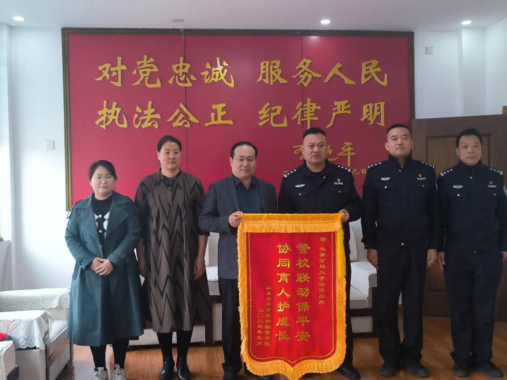 4月9日,在学校保卫处负责人的协调带领下,外国语学院副书记、学生党支部书记、辅导员将一面写有“警校联动保平安,协同育人护成长”的锦旗送到了大学路派出所赵所长手中,以此致谢派出所民警长期以来维护校园安全、保护师生周全所付出的辛苦努力,并就支部共建共联达成意向,深入交流。