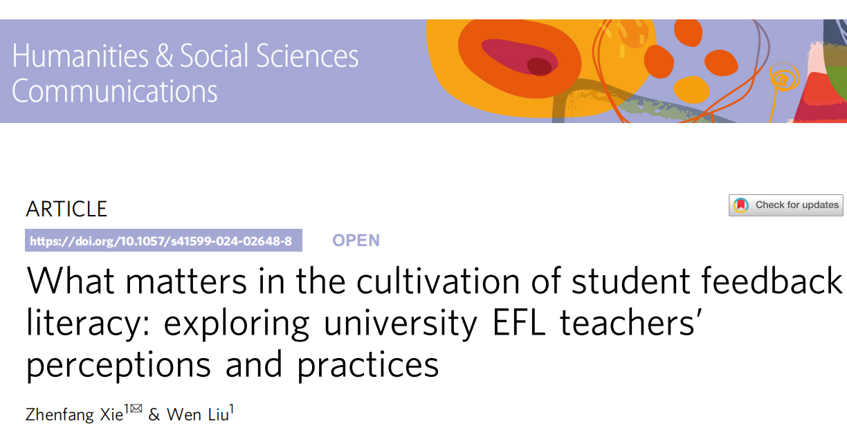 由我院教师解珍芳和刘雯撰写的论文What matters in the cultivation of student feedback literacy: exploring university EFL teachers’ perceptions and practices发表在刊物Humanities & Social Sciences Communications上。Humanities & Social Sciences Communications是Nature旗下唯一的文科综合类刊物,致力于出版人文社科领域的高水平研究,同时被SSCI(一区)和AHCI收录,在国内外的人文社科领域具有重要影响力。