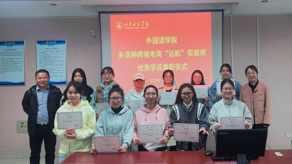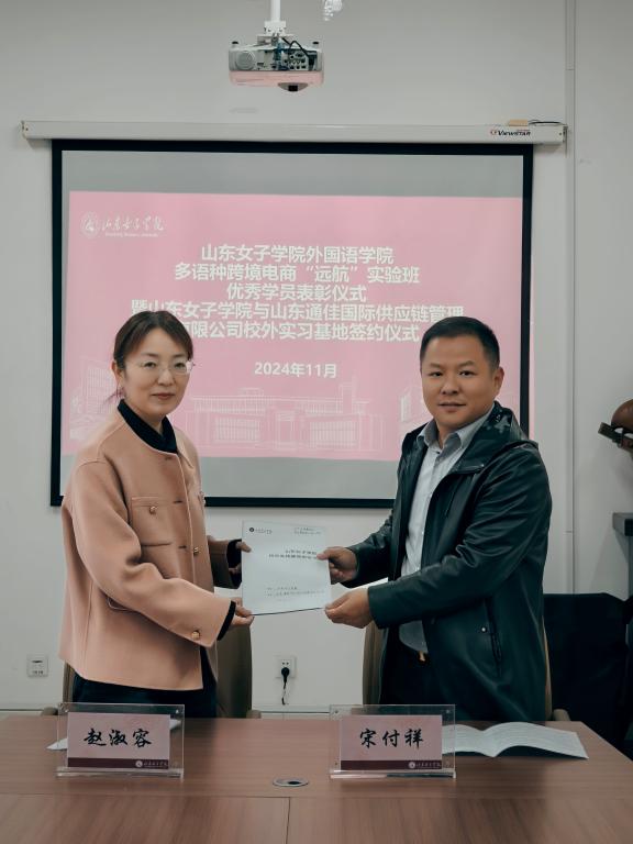 11月14日下午,外国语学院多语种跨境电商“远航”实验班优秀学员表彰仪式暨山东女子学院与山东通佳国际供应链管理有限公司校外实习基地签约仪式在求实楼509举行。