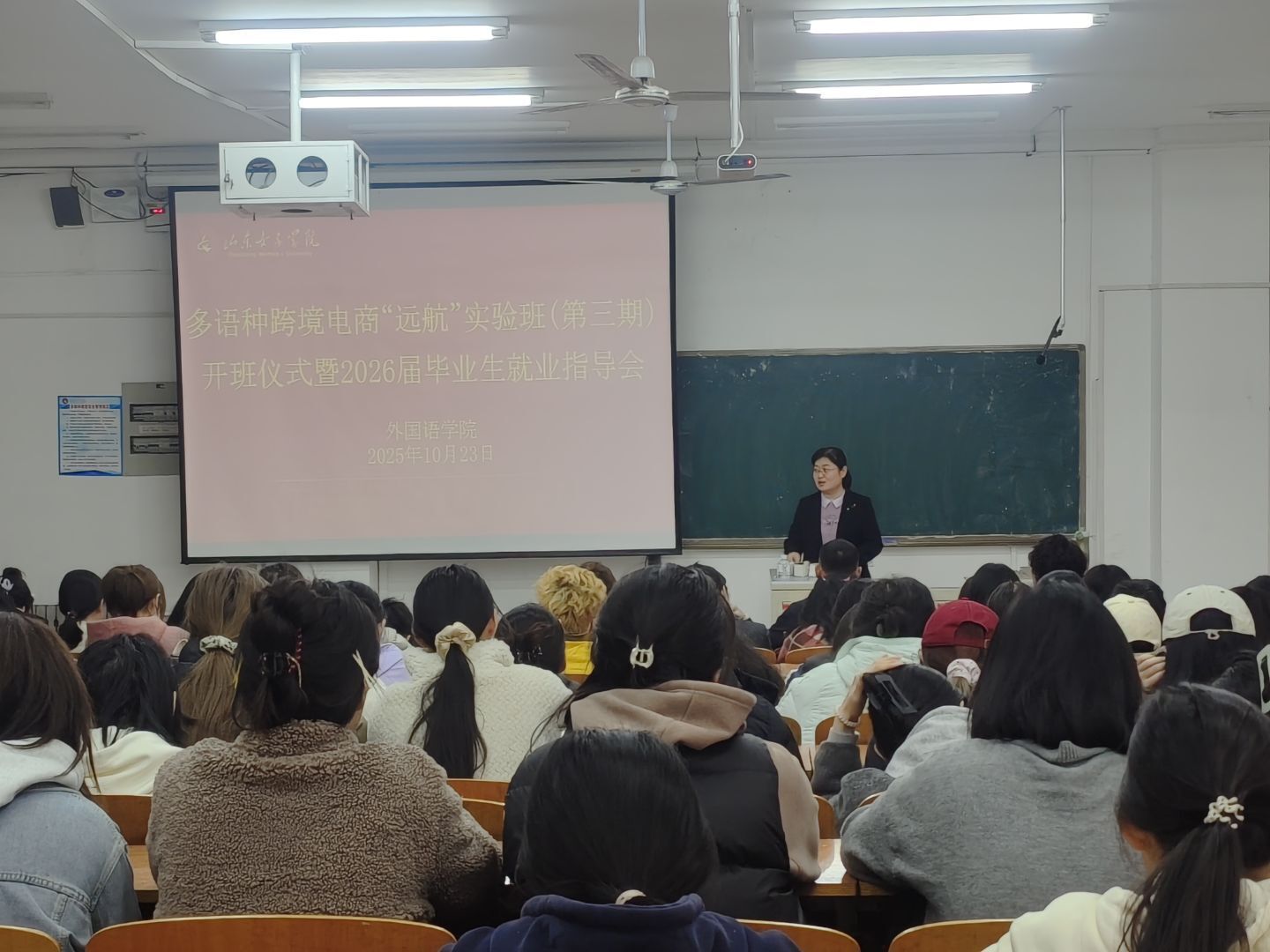 为进一步创新人才培养模式,提升外语类专业毕业生外贸实践能力,助力毕业生高质量充分就业,10月23日下午外国语学院举办多语种跨境电商“远航”实验班(第三期)开班仪式暨2026届毕业生就业指导会,企业代表、学院相关负责人、毕业班辅导员及2026届毕业生参加会议。