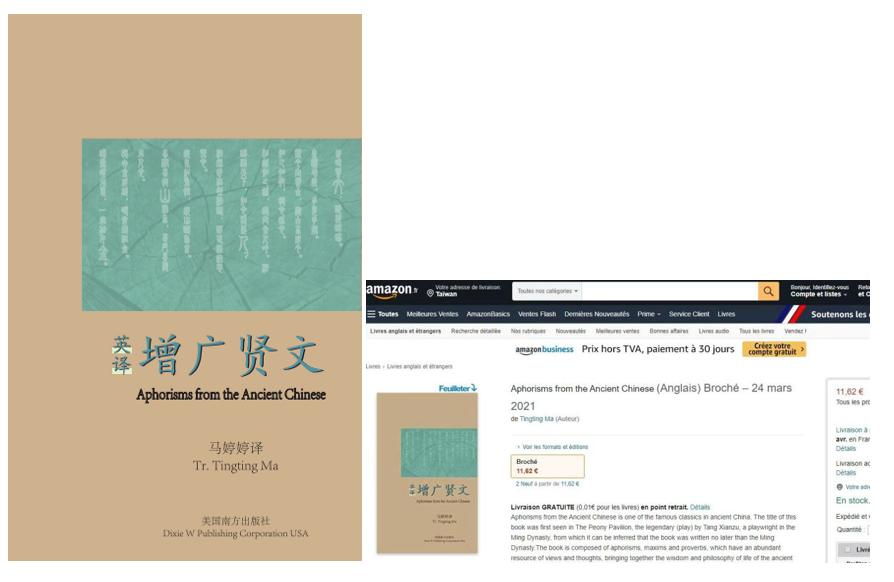 马婷婷老师的《英译增广贤文》(Aphorisms from the Ancient Chinese)作为典籍英译图书,是欧美世界第一个正式出版的《增广贤文》全译本,由美国国会图书馆(Library of Congress Control Number)备案注册并入藏(备案号:2021934576), 被全球最大的中文图书在编数据库“读秀”收录,已在世界最大的零售连锁书店巴诺书店(Barnes & Noble)上架出售,同时由亚马逊(Amazon)在世界范围发行,kindle同步上架,国外上架一个月内,已有37个国家和地区的网上书店发售。该成果在国内被收藏于北京外国语学院图书馆、超星数字图书馆、外语教学与研究出版社和山东女子学院图书馆,在“豆瓣”等国内优秀读书网站上架,被“百度词条”收录。