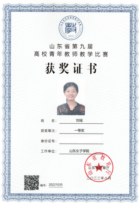刘瑶老师获得山东省青年教师教学比赛一等奖