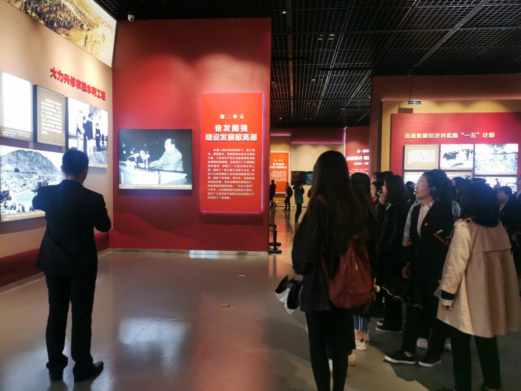 山东省为庆祝中华人民共和国成立70周年,举办了“奋进的山东” 为主题的成就展,本次成就展以时间为主线,分为“百废俱兴艰苦创业”“勇立潮头砥砺前行”“走在前列全面开创”三个部分,通过典型图片、实物资料、场景还原、动态演示等方式,多角度、全景式集中展示了中华人民共和国成立70年来,山东经济社会发展取得的辉煌成就,展示了山东人民奋发有为、开拓进取的精神风貌,感受到人民群众生产生活的新变化和实实在在的获得感幸福感安全感。参观学习过程中,大家坚定地站在党旗下,举起右手,紧握右拳,慷慨激昂的说出入党誓词,激发出全体党员的热忱。成就展内一件件实物模型、一张张图片图表、一段段影像资料,吸引了学生党员们的目光。大家不时停下脚步仔细观看,认真听取工作人员讲解,并详细询问有关情况,表示要更加紧密地团结在以习近平同志为核心的党中央周围,增强“四个意识”、坚定“四个自信”、坚决做到“两个维护”,不忘初心,牢记使命。