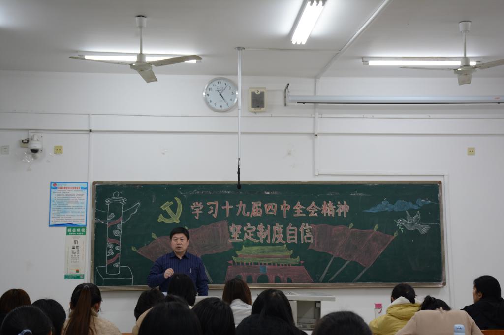 为深入贯彻落实党的十九届四中全会精神,12月10日下午,在博学楼318教室外国语学院党总支书记董玉新为60多名入党积极分子上了一堂以“学习十九届四中全会精神,坚定制度自信”为主题的微党课。