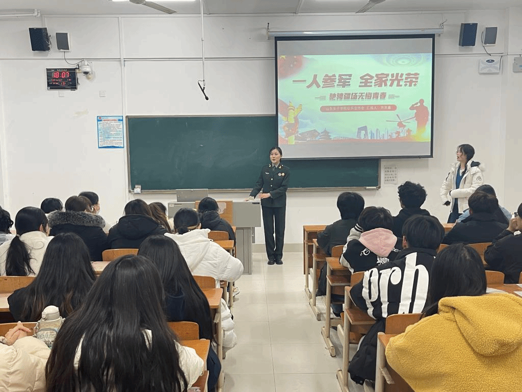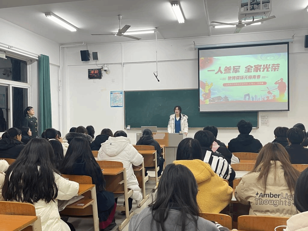 11月27日,外国语学院退伍学生2021级应用韩语苏英鑫同学作为学院征兵形象宣传大使在博学楼114教室开展征兵宣讲。