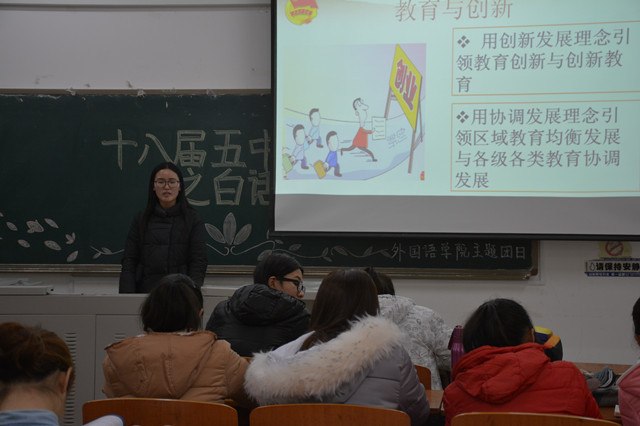 11月30日晚,外国语团总支于普教楼312举办了“十八届五中全会之白话十三五”主题团日活动,2014级、2015级主要学生干部参加了本次活动。