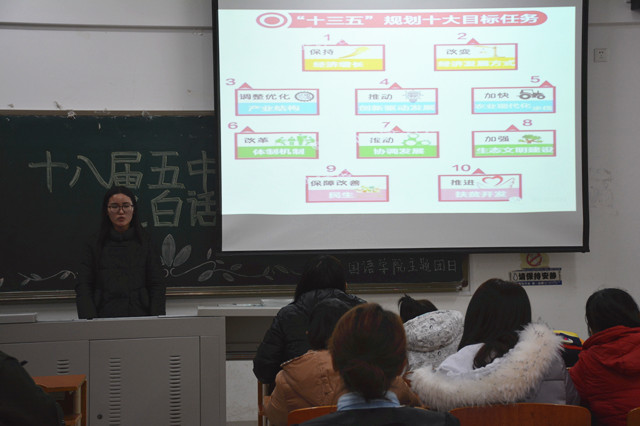 活动伊始,主持人以PPT与视频结合的形式,带领大家从宏观上认识了十八届五中全会,认真学习了此次会议做出的重大决定及会议精神,并详细介绍了十三五规划以及国家出台的各项新政策。与会学生围绕“如何看待十三五规划”这一话题展开了热烈的讨论,日语学生代表就“生态文明建设”这一话题,表达了大学生要从不乱扔垃圾,拒绝校园不文明行为等身边点滴做起;商务英语学生代表也就“教育公平与创新”这一问题,表明了女大学生更要学习好专业知识,积极投身祖国建设。学生们纷纷表示要充分担当起大学生自身的责任和使命,用自己的实际行动,深入贯彻践行“创新,协调,绿色,开放,共享,发展”的理念,关心政治生活,拥有社会责任感,为十三五规划贡献自己的一份力量。