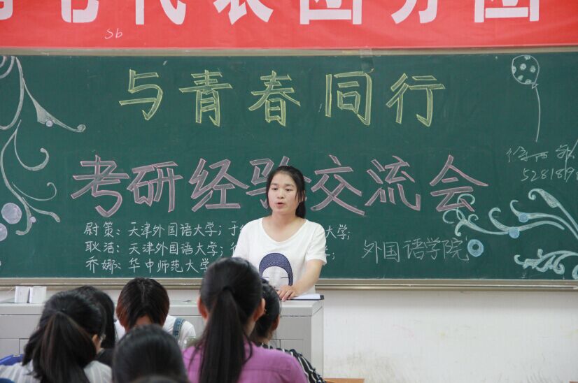 “与青春同行”——考研经验交流会,是外国语学院对准考研学生进行就业意向摸底调查后举办的一次经验分享交流会,有利于学生明确考研目标,调整备考心态,改进备考计划,增强对考研的信心和决心,对构建浓厚的学习氛围具有积极作用。