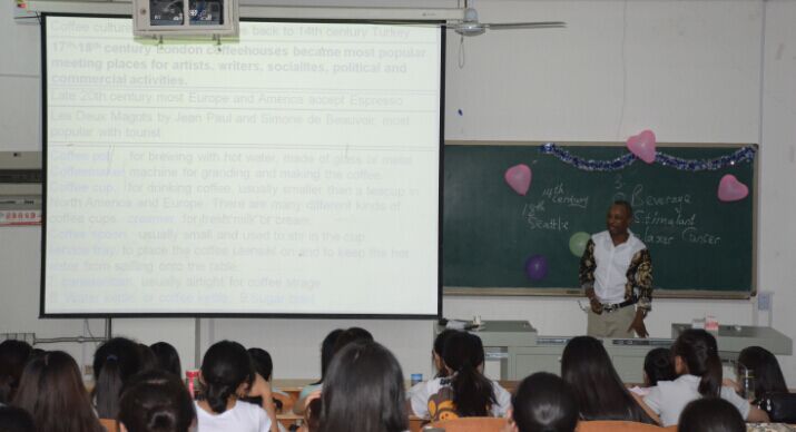 压轴登场的外教Sam为大家具体讲解了美国的咖啡文化和礼仪。Sam积极与现场同学交流互动,讲解文化的同时还带领大家一起练习英语口语。在浓浓的咖啡香气里,师生共聚一堂,共同体验了咖啡的精致与内涵。