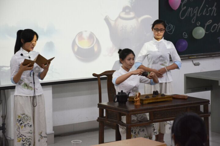 第十一期外语角活动共分为四个环节。首先,来自旅游学院、刘迪同学带领的“书香茶韵”团队为大家带来了精美绝伦的茶艺表演。他们在近期举行的第十四届山东省大学生文化艺术节大学生传统茶艺表演大赛荣获团队三等奖。在悦耳动听的古筝曲《琵琶语》中,主泡师刘迪同学优雅的动作,主讲师耿卫同学美妙的解说,伴舞张力元同学优美的舞姿,让台下同学充分领略了茶艺表演独具的视听魅力。