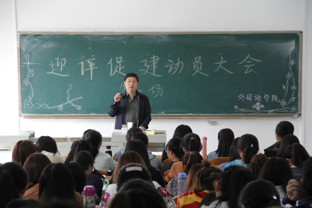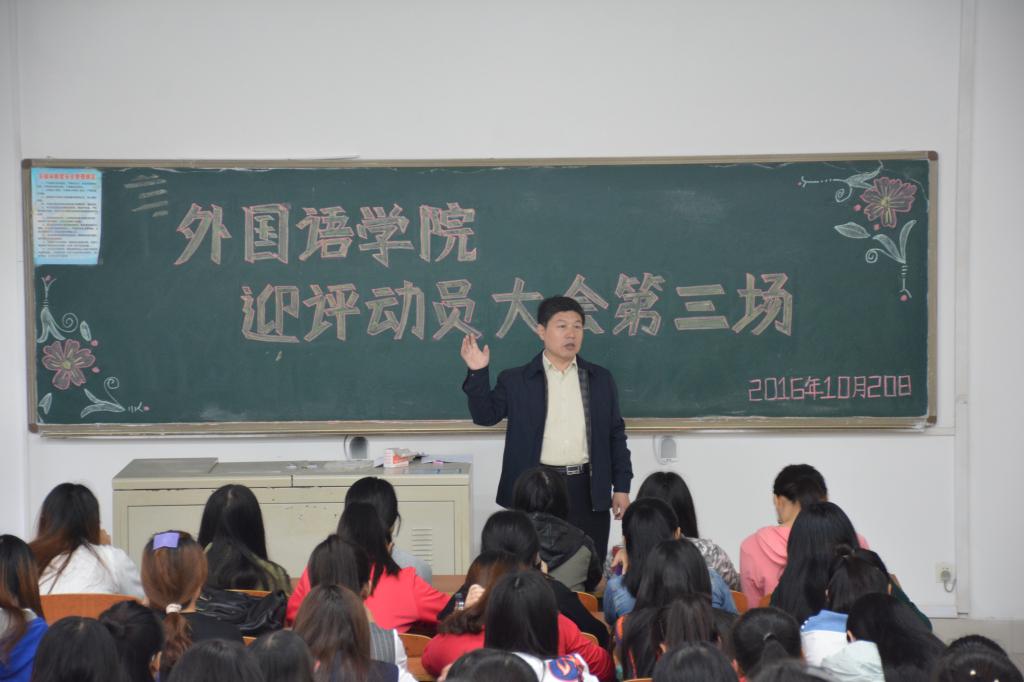 10月18日上午,外国语学院在博文楼101教室召开迎评促建动员大会(第一场),学院党总支书记董玉新为2014级商务英语、应用西班牙语和应用韩语三个专业的全体学生做了动员报告,会议由辅导员老师主持。