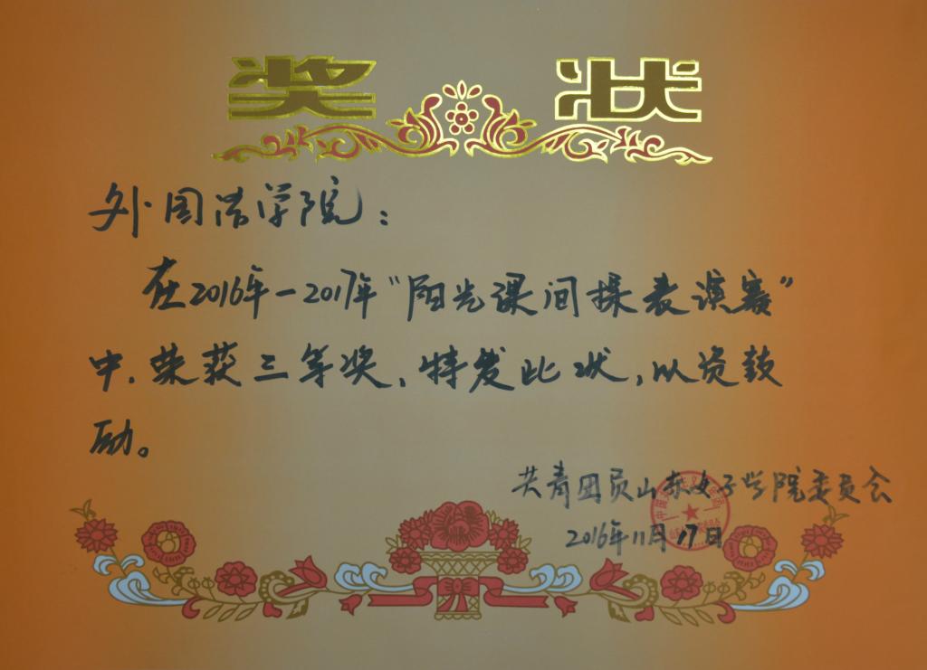 11月17日,我院32名学生组成的代表队在2016-2017学年第五届阳光课间操比赛中取得了第四名的好成绩,荣获三等奖。