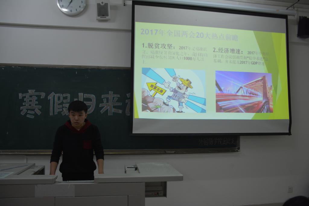 活动分两阶段进行。第一阶段,主讲人张译镭以PPT的形式回顾了寒假期间发生的国内外大事,通过解读政府工作报告的重点内容,分析我国当前的发展状况和国际定位。学生们就社会热点问题进行了热烈的讨论和交流。第二阶段,学生们结合“最美微‘孝’瞬间”和“我的春节我做主”两个社会实践主题活动,分享自己假期的实践成果:美的眼睛拍摄美的景色,感恩你我身边的“微孝”,走访敬老院,外出打工等。此外,对于新学期,学生们也都明确了前进目标,制定了规划。最后主讲人总结了寒假社会实践作业的完成情况和完成效果,并提出了建议和意见。