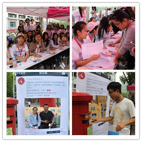 外国语学院为迎接新生,特别制作了欢迎海报、大邮筒及“致四年后的自己”的明信片等宣传工具。欢迎海报以新颖别致的话语介绍了外国语学院,欢迎新同学的加入。每位新生在明信片上写下自己对未来的期许,并投放到邮筒内,以“时光机”的形式展示出来。别出心裁的宣传形式吸引了新生和家长们驻足观看。