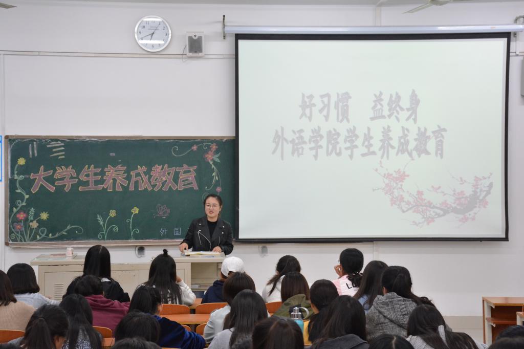 10月23晚,外国语学院于博文楼204教室开展大学生养成教育宣讲活动,由2017级英语(专升本)学生党员徐思齐担任主讲人,2017级全体班委和各宿舍长参与宣讲活动。