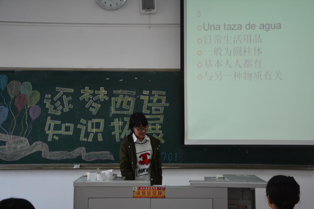 首先,团支部副书记简明扼要的介绍此次活动的主要目的及意义,并向大家分发事先准备的小礼品,活动由此展开。学生们以抽签的形式分为三个小组,依次入座。活动包括介绍西班牙著名建筑、特色舞蹈和文化风俗、介绍西班牙经典歌曲以及“戏游西语”三个环节。在前两个环节中,主讲人以PPT的形式对西班牙著名影片《吾栖之肤》进行详细介绍,并展示西班牙歌曲的歌词来源与含义,激起了学生的参与兴趣。最后的互动环节包括乒乓西语大碰撞、西语口语666、词语词汇猜猜猜三个小竞赛,每组派出代表上前作答,其中在“词语词汇猜猜猜”中,大家要通过汉语的提示来抢答单词的正确含义,学生们的答案千奇百怪,台下掌声笑声不断。最后根据各组的总得分评选出此次活动的优胜小组并颁发奖品。
