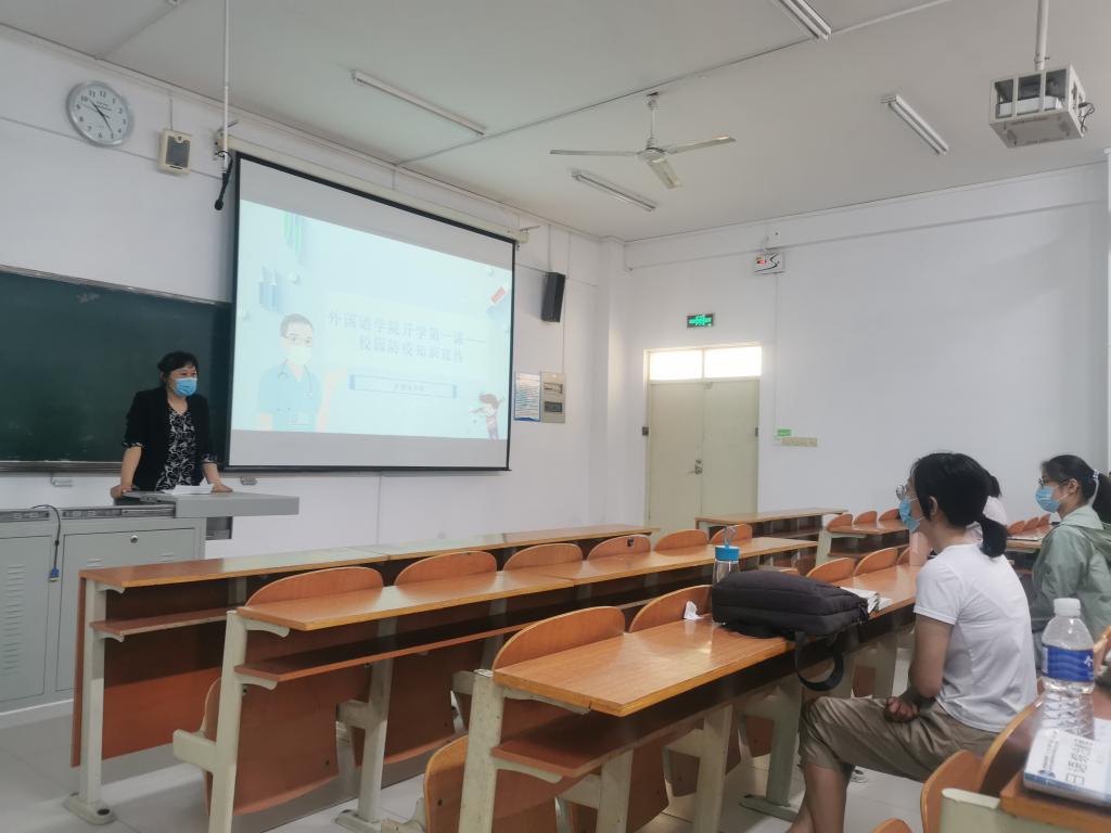 活动伊始,学生们集体观看了校园疫情防控视频,保证大家能够充分熟悉校园中应急处置的基本流程,详细了解疫情防控知识和复学期间的注意事项。随后,外国语学院党总支副书记耿华对返校同学表达了热烈的欢迎和亲切的问候,并向大家介绍了为迎接返校学生,确保学生复学顺利进行,学院在校园管控、学生管理、教学工作、服务保障等方面作出的细致部署;同时介绍了今年特殊情况下国家对高校应届毕业生的政策支持,回应了大家对毕业就业等问题的热切关注。紧接着,曹丽娜老师为学生进一步讲解了疫情防控期间学校的学生教育管理相关制度规定,以及有关就餐、浴室使用、拿取快递、行李托运等与学生生活密切相关的注意事项。