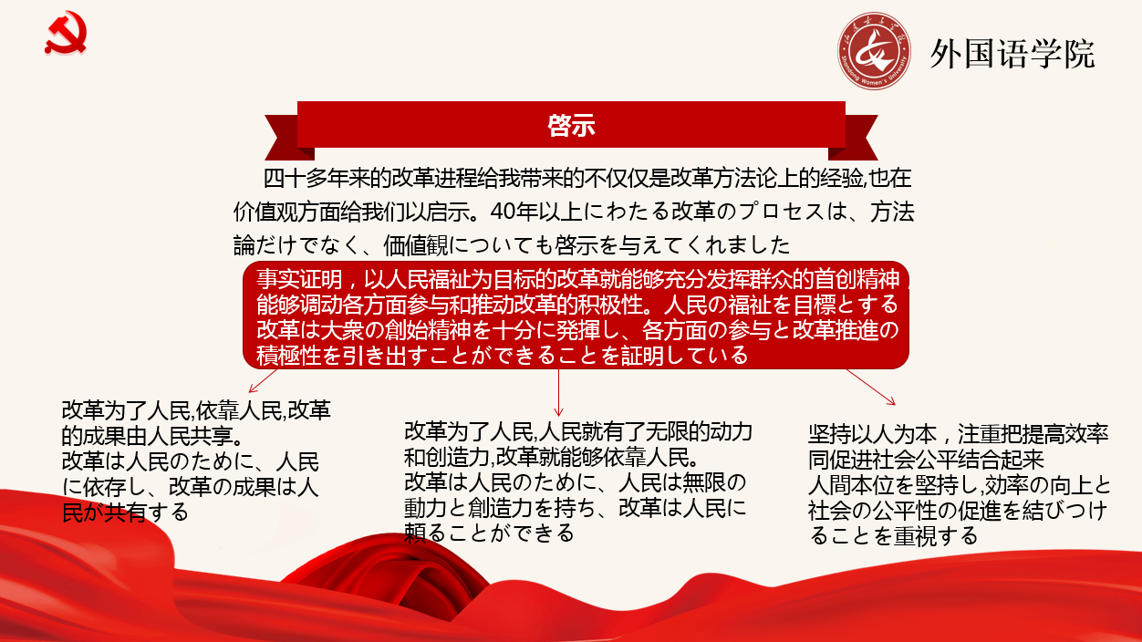 日语专业刘欣以“改革开放 继往开来”为主题,采用中日双语讲解方式,从改革开放的基本脉络、改革开放史是中国共产党推进社会主义制度自我完善和发展的历史、改革开放的经验总结三个方面带领大家回顾了新中国改革开放40多年的成就以及与时俱进的理论创新和实践努力。鼓励大家将党史精神内化于心、外化于行,把学习领悟党的百年历史作为践行党的初心和使命的重要途径。