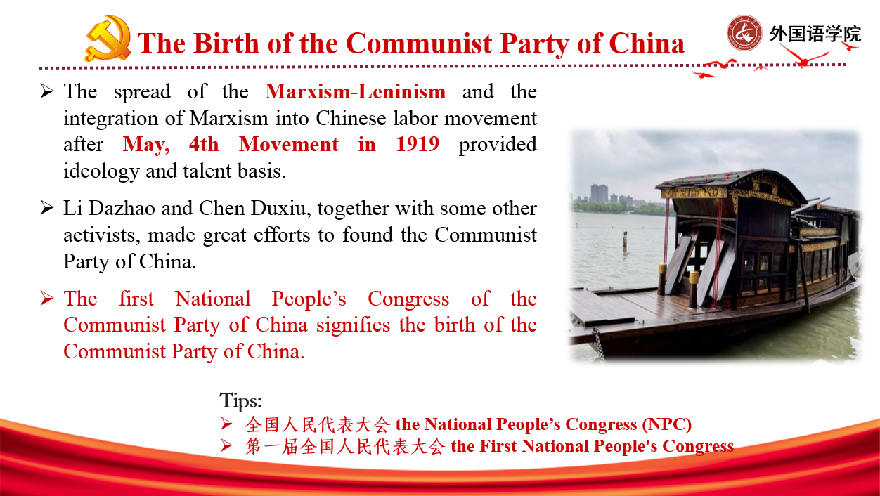 英语专业王紫腾以“The Foundation of Chinese Communist Party”为题,通过“党的建立历程”-“党的理论学习”-“用英语表达特色词语”-“对英语学习者的建议”四部分展现了中国共产党建党百年来的光辉历程和经验总结。并采取中英文对照的方式,对“中国特色社会主义”“八荣八耻”、“社会主义法治国家”“中国力量”“人类命运共同体”等英文术语进行讲解翻译。她说,作为外语专业的学生,我们要发挥专业优势,坚定文化自信,用流利的英语,把现代化中国更好地展示给世界。