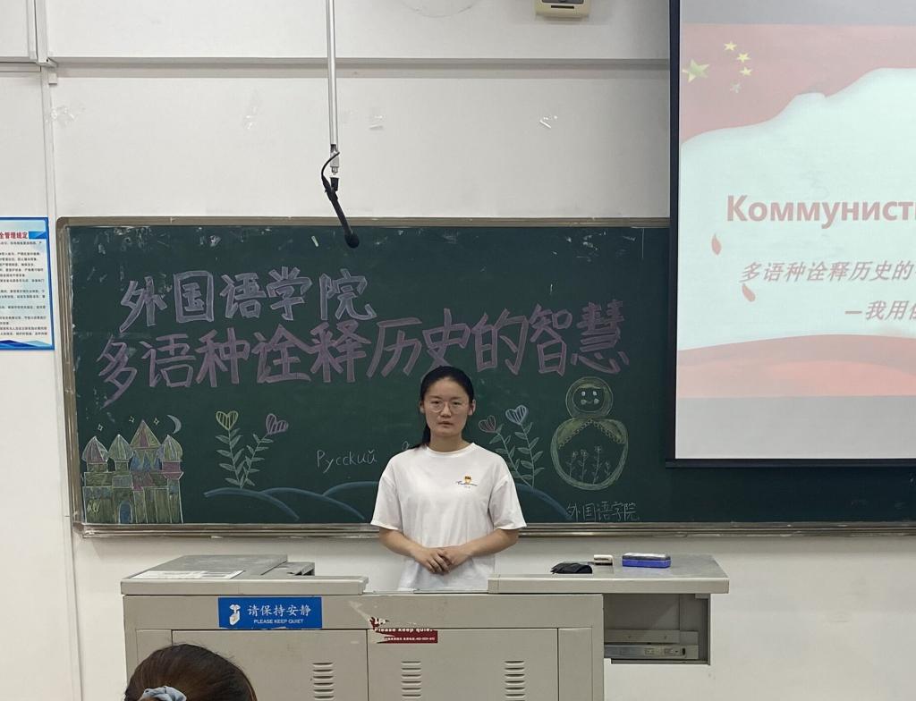 俄语专业程颜开展中俄双语演讲,从“党的奋斗历程”“中国人民的奋斗历史”“中国新时代的发展”三方面带领大家回顾了我们党团结带领中国人民不懈奋斗的历程,并对当下“中俄核能合作项目”“《中俄睦邻友好合作条约》签订20周年”等专业相关的时事热点与大家进行了解读探讨,引导大家学习历史,关注时事,提升个人的思想道德修养。