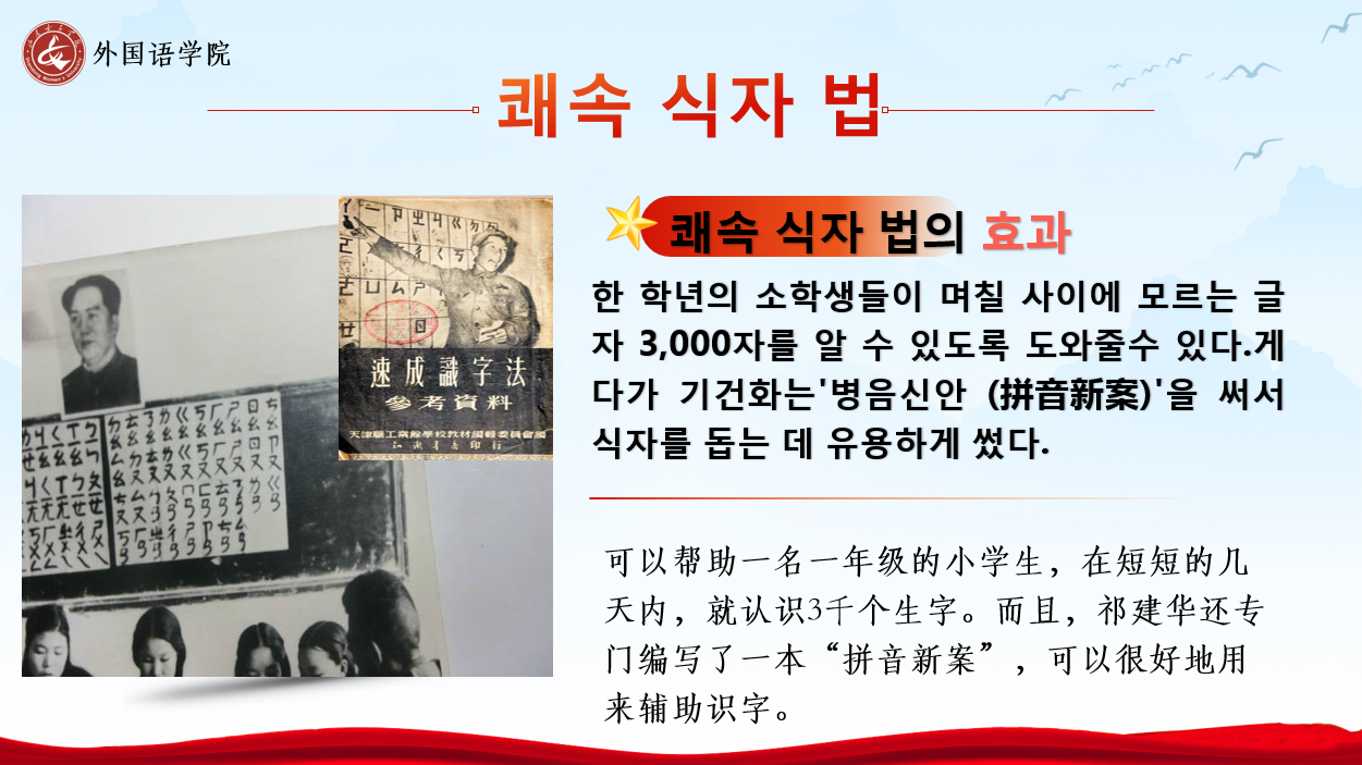 应用韩语专业张雪以新中国成立初期轰轰烈烈的“扫盲运动”为切入点,深入浅出的讲解了“为什么要进行扫盲运动”“怎样实行的扫盲运动”,“扫盲运动带给我们的启示”三方面内容。张雪表示,我们要从历史经验中汲取力量,不断学习和迭代,彰显青年一代理想担当,为构筑中国精神、中国价值、中国力量注入生气勃勃的青春动能。