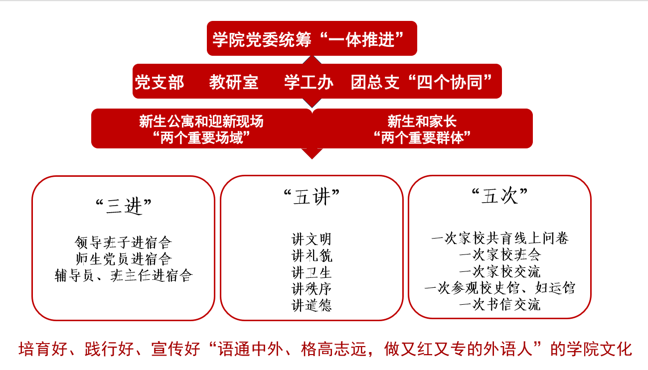 外国语学院实施“14213”特色迎新,“1”即学院党委统筹一体推进;“4”即党支部、教研室、学工办、团总支协同发力;“2”即两个聚焦:聚焦学生公寓和迎新现场两个重点场域,聚焦新生和家长两个重要群体;“13”即三进、五讲、五次行动,培育好、践行好、宣传好“语通中外、格高志远,做又红又专的外语人”的学院文化。