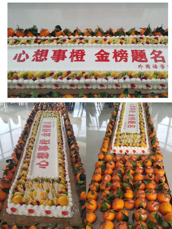 12月12日,外国语学院为努力争取“上岸”的考生们定制的2米的大蛋糕和寓意着心想事“橙”的大橙子,温暖感动着在场的100余名学生。成功上岸的往届学姐学哥们也通过视频连线为学弟学妹们加油鼓劲,心想事“橙”。学院赵院长代表全体老师殷切嘱托和暖心叮咛,为同学们切送蛋糕祝愿金榜题名。