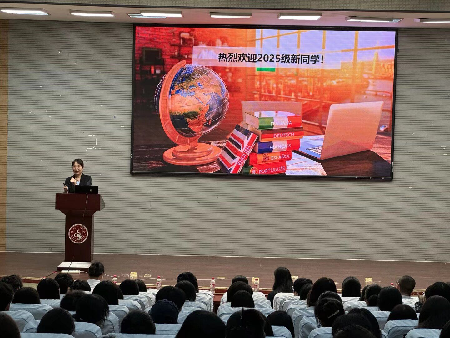 9月28日晚,外国语学院以“语通中外,格高致远”为主题的2025级新生开学典礼暨思政大讲堂在图书馆一楼报告厅隆重举行。学院领导班子成员、辅导员、新生班主任以及全体2025级新生齐聚一堂,共同迎接大学生活的崭新起点。典礼由学院党委副书记主持。