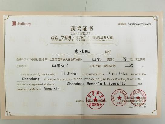 英语专业学生获得外研社全国英语演讲比赛山东省一等奖