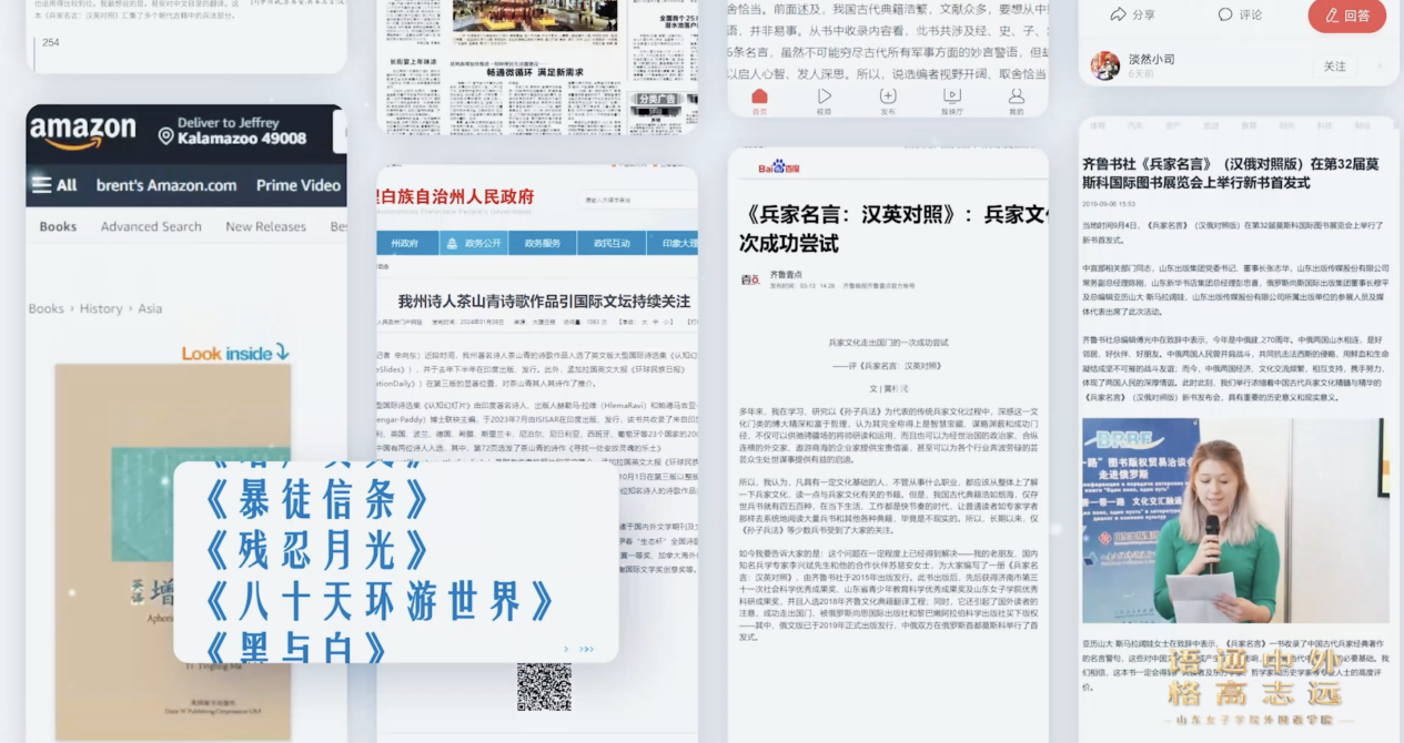 马婷婷老师的《英译增广贤文》(Aphorisms from the Ancient Chinese)作为典籍英译图书,是欧美世界第一个正式出版的《增广贤文》全译本,由美国国会图书馆(Library of Congress Control Number)备案注册并入藏(备案号:2021934576), 被全球最大的中文图书在编数据库“读秀”收录,已在世界最大的零售连锁书店巴诺书店(Barnes & Noble)上架出售,同时由亚马逊(Amazon)在世界范围发行,kindle同步上架,国外上架一个月内,已有37个国家和地区的网上书店发售。该成果在国内被收藏于北京外国语学院图书馆、超星数字图书馆、外语教学与研究出版社和山东女子学院图书馆,在“豆瓣”等国内优秀读书网站上架,被“百度词条”收录。