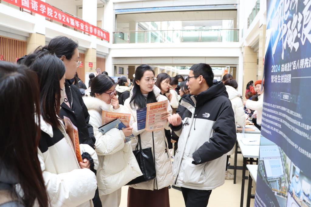 校长李光红在招聘会现场调研活动的参与情况和实际效果,亲自向企事业单位推介我校学生,详细了解用人单位的人才需求、对学校就业工作的意见建议,并与其探讨开展进一步深入合作的路径与方式。招就处、外国语学院相关负责人在招聘会现场与企业开展洽谈,碰撞出校企进一步深入合作的“火花”。外国语学院教研室主任、就业导师、辅导员、班主任全程跟进现场指导,主动对接企业推荐,询问学生应聘情况,帮助学生分析解惑。